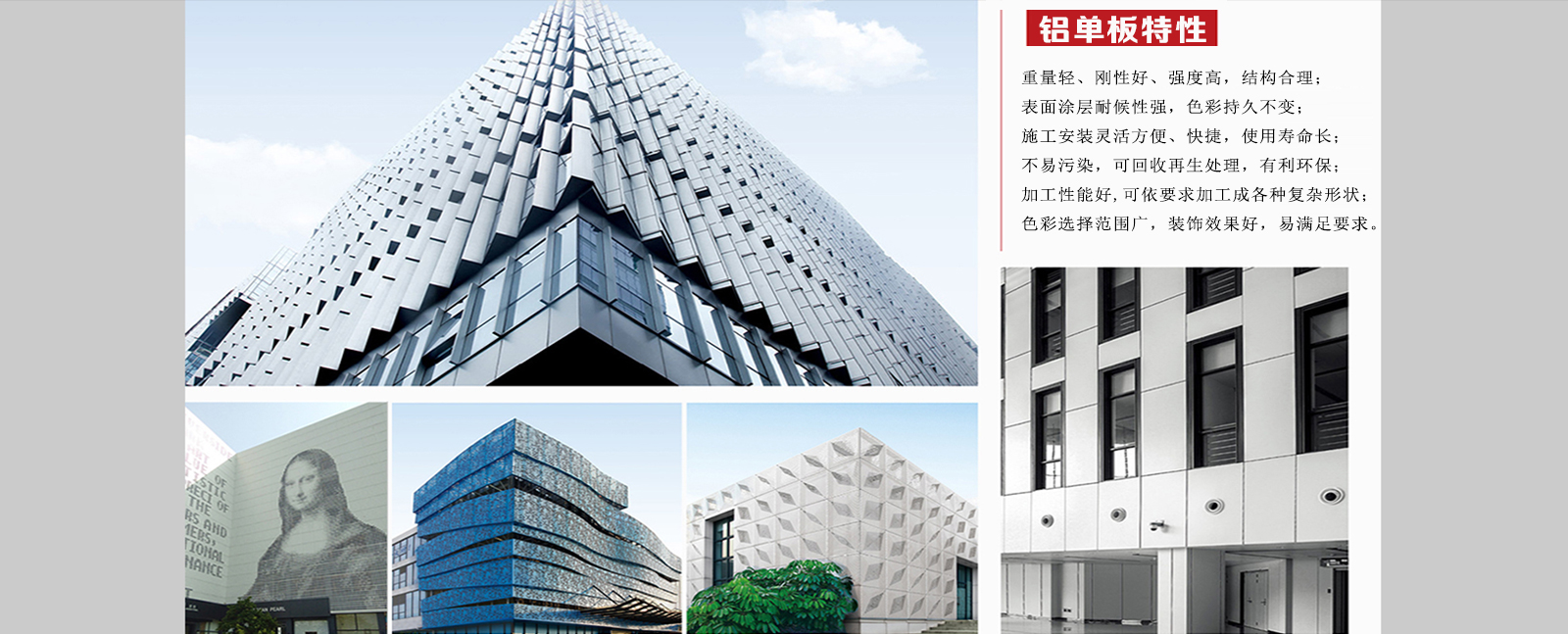 鋁單板工程案例山東.臨朐筑隆金屬制品有限公司的產(chǎn)品可應(yīng)用于:建筑物外墻、梁柱、門(mén)頭、陽(yáng)臺(tái)、雨棚、…